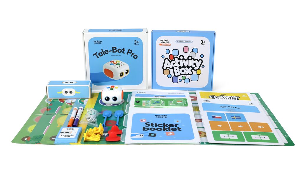 Комплект состоит из 3 роботов MatatalabTale-Bot и набора тематических карт, и стикеров.