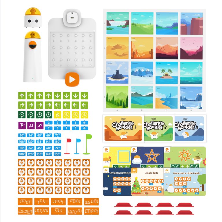 В составе набора: робот, управляющая башня, контрольная панель, блоки программирования, обучающая брошюра, специальное поле с пластиковыми элементами. Управляющая башня и робот оснащены аккумуляторами, которые заряжаются через интерфейс USB (5 Вольт). Программа составляется с помощью пластмассовых блоков (без электроники внутри), на которые нанесены интуитивно понятные символы (стрелки, цифры, ноты, градусы и т.п.). Блоки располагаются на специальной контрольной панели в зоне видимости камеры.