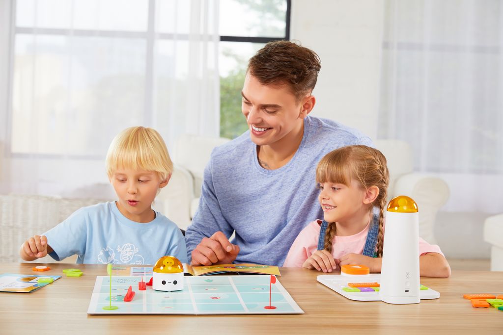 Комплект состоит из: робота – 3 шт., разноцветных чехлов для робота – 3 шт., управляющей башни – 3шт., контрольной панели – 3 шт., игрового поля – 3 шт., блоков программирования из пластика – 297 шт., фломастеров – 9 шт., обучающих брошюр – 3 компл. по 3 шт. и карточек с примерами заданий – 3 компл. по 6 шт., пластиковых барьеров – 24 шт. и флажков – 9 шт.; кабеля для зарядки – 3 шт.
