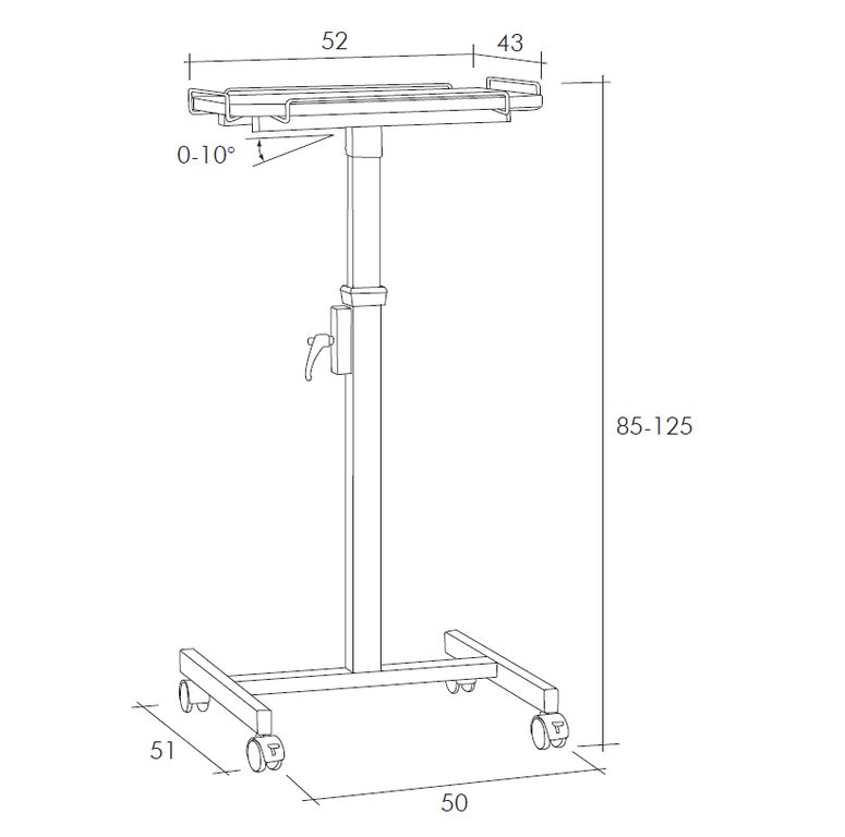 - Столик передвигается на колесах, каждое из которых снабжено стопором, угол поворота колес – 360 градусов