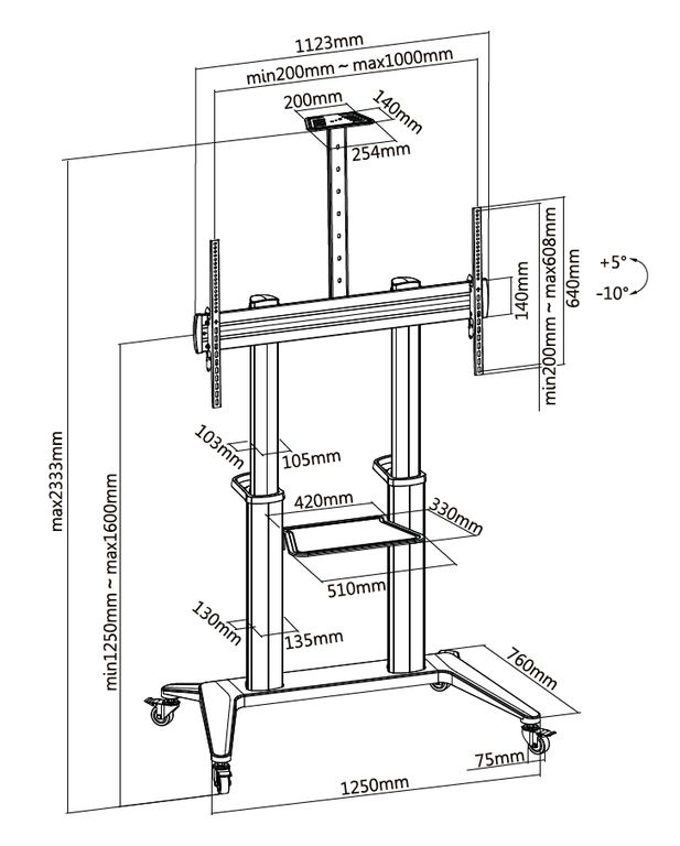 Наклон -10°/+5°, регулировка высоты ТВ и полок для камеры и источников (полки в комплекте).
