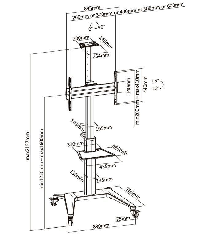 Безынструментальный наклон -12°/+5°. Регулировка высоты ТВ и полок для камеры и источников. Поворот в портретное положение (90°)